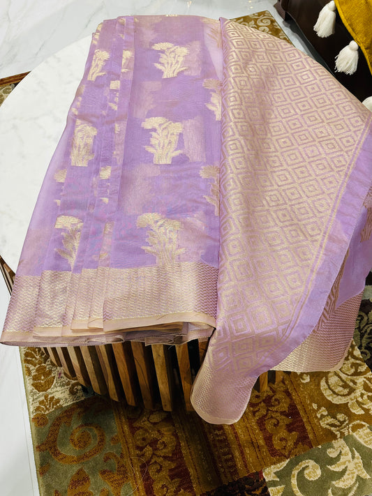 Lavender & Golden Woven Design Banarasi Organza Saree