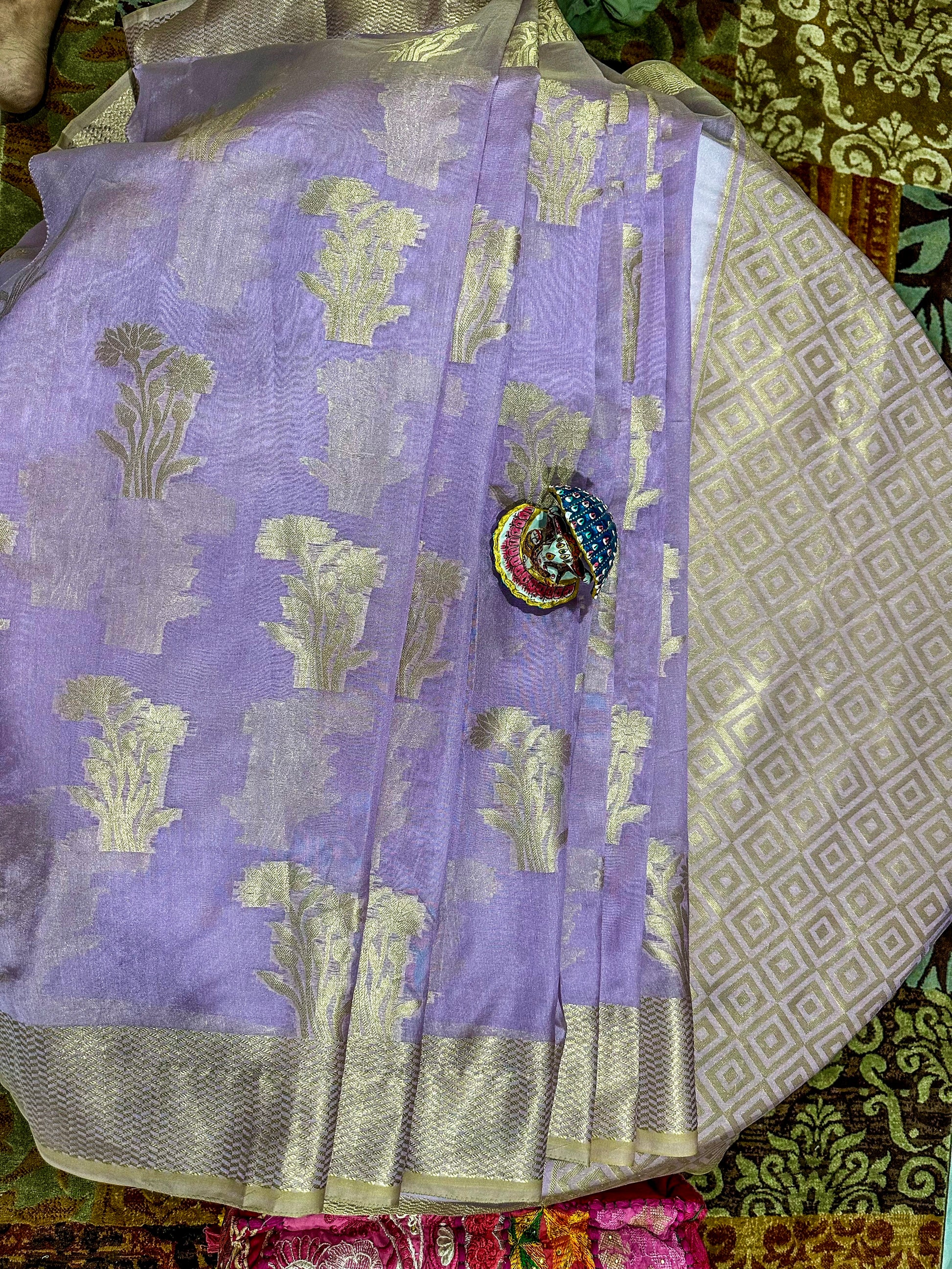 Lavender & Golden Banarasi Organza Saree โ A Dreamy Fusion of Elegance and Grace ๐โจ